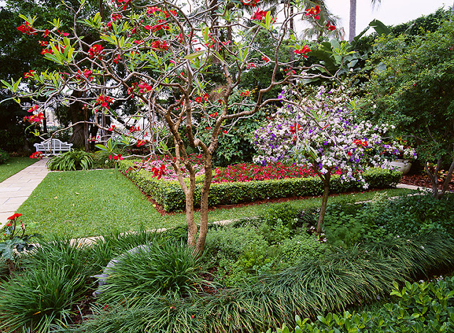 Garden of Eden, #5: Now take a hot desert-like garden and add really high humidity - then you can grow some very different types of plants all on top of one another and they will thrive. This garden is back in Florida and it is both a spectacle of texture AND color. The mix here includes ferns, agave, bromeliads of amazing size, palms, crown of thorns, and variegated tropicals, some almost tree-like. This large estate had "islands" of these that were constructed around the grounds of the home, and they have served as an inspiration to me in building my new garden at the beach because I am going to adapt the concept of the islands as a water-saving method. Mine will NOT look this lush, but wait and see.