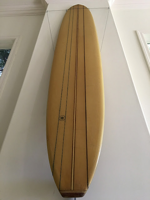 The Daze of My Life, #8: Often classmates from Webb joined me in Hawaii, and we would take summer jobs at my father’s company, so we would all have some income. With cash in the bank, in the fall of ’65 I decided to sell the Jacob’s Concave and design my own board. Sam Scranton, my friend from Webb with whom I surfed, knew staff at Wardy surfboards in Laguna Beach. Sam was also joining me in Hawaii the next summer and he wanted a new board as well, so we worked together on design/style ideas, and he got Wardy to shape the boards. Many think the Wardy shop approached making boards as an artform, so the board shape was their work, but I also wanted to contribute to their artfulness and I created the deck, stringers, and tail design. My board was 10’2” in length, and as you see here, featured some specific details: the “stringer” down the middle is a laminate of a balsa wood surrounded by redwood strips of equal width; the tail block is similarly layers of redwood and balsa; the right side of the board is offset with an oak stringer, visually balanced by two paint pin-stripes and the Wardy logo decal on the left side. As you see it, this board currently decorates the chimney of my living room fireplace.