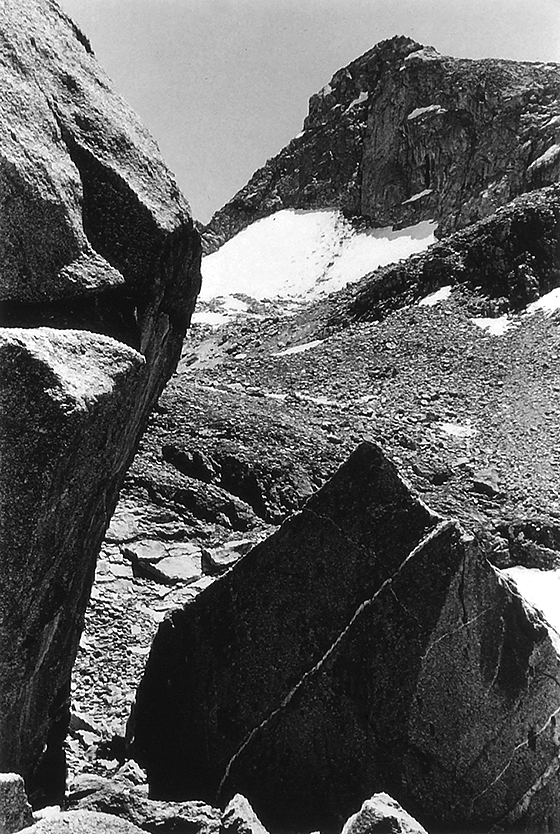 Our band of late season hikers is now very close to the lake basin beneath the backside of East Temple Peak and spire. My partner, Vicki Golden, is facing me, and Gordon Williams is in the distance, surveying the last part of our route. Just above his head in the granite wall there is a raking angle of light that flows from the upper left, to the lower right. That is a navigable series of descending slabs which we are about to use as our staircase into the upper lake section of the Aurora (Vicki’s name) basin. This shortcut will save us about 1hr. of time, and bring us into the basin at the top of the lake chain, instead of the bottom. The Higher You Get, The Higher You Get.